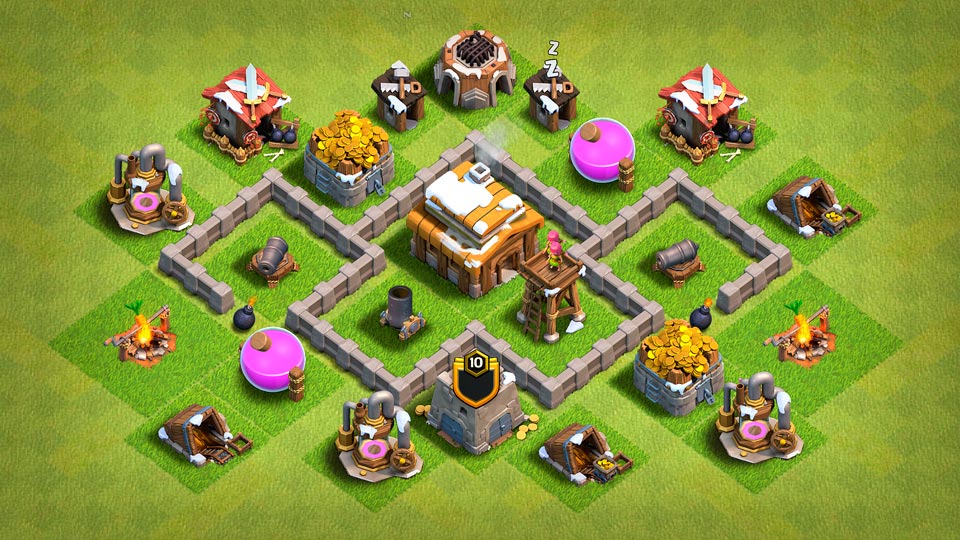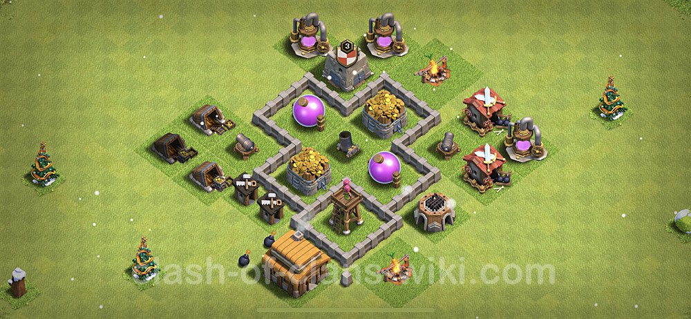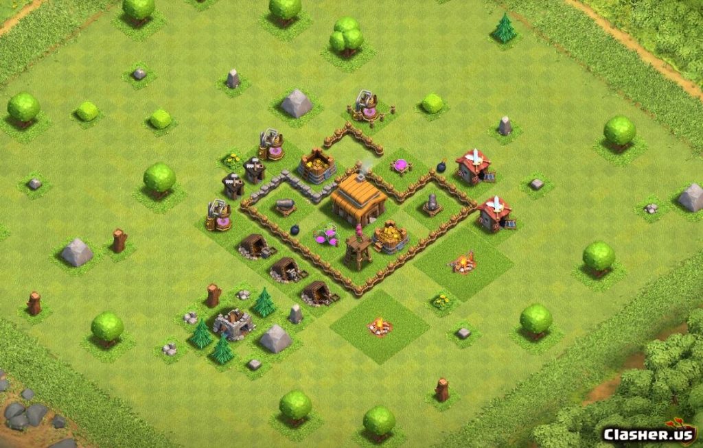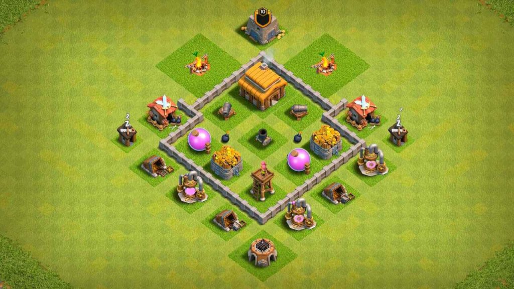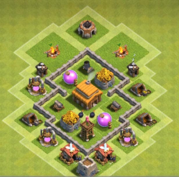 Jika base 3 lebih melindungi bangunan TH. Maka, base ini lebih melindungi emas milik kamu dari penjarahan pasukan lawan kamu. Kamu dapat lihat dari bangunan penyimpanan emas dalam tembok pertahanan. Bangunan pertahanan juga terdapat pada sekitar bangunan penyimpanan emas.