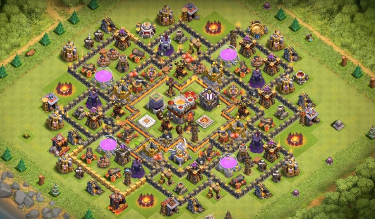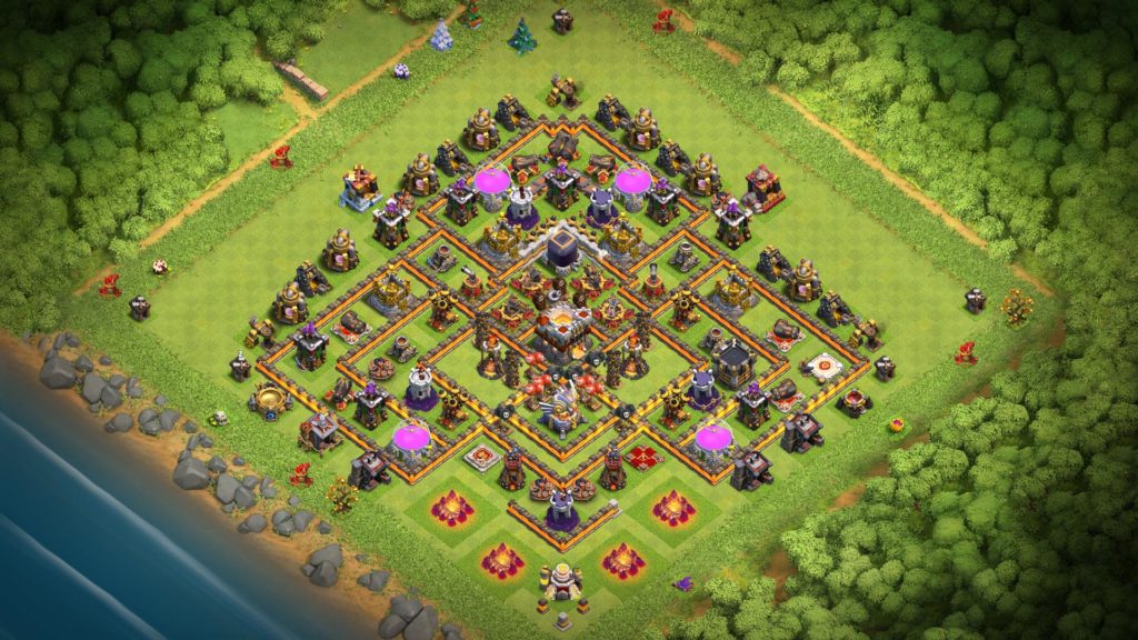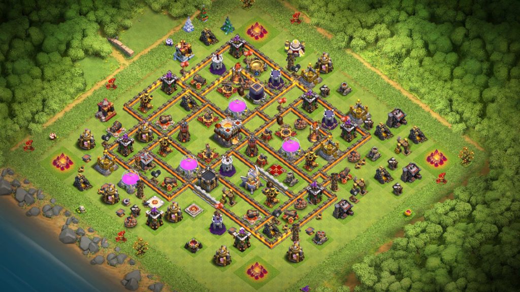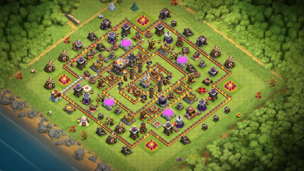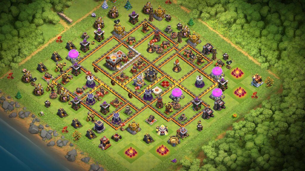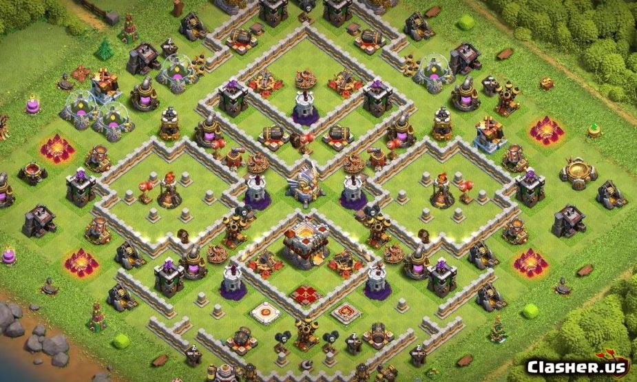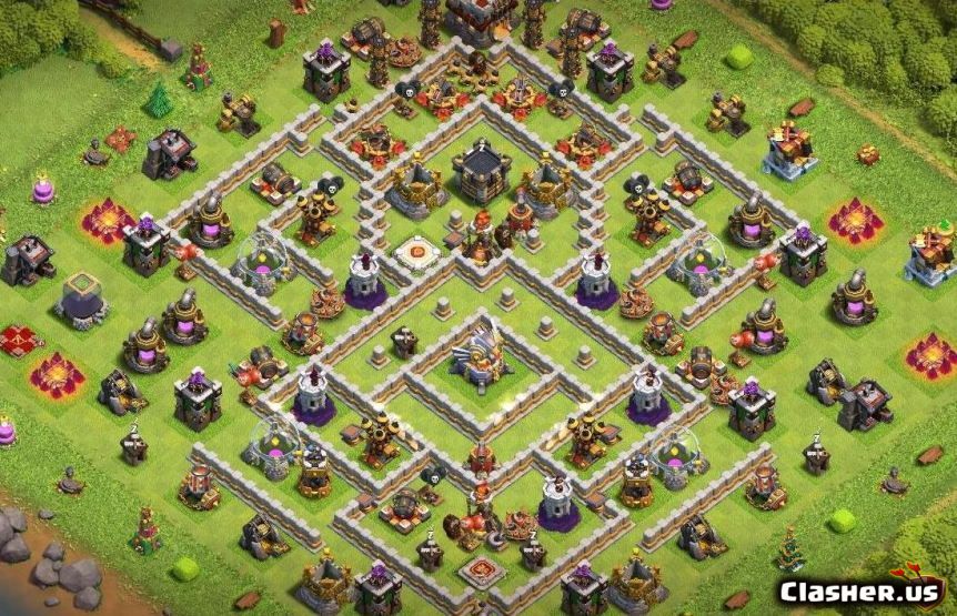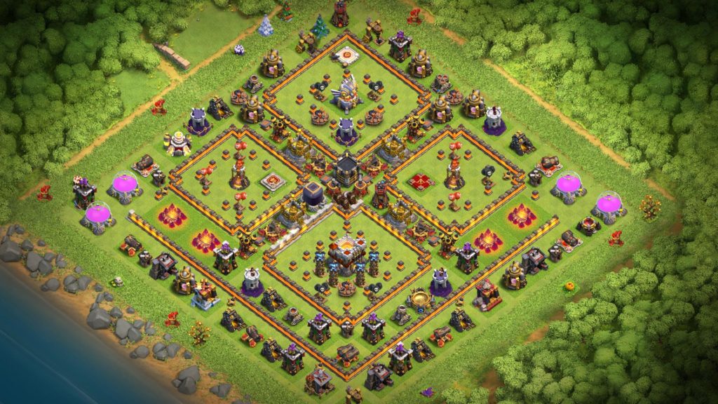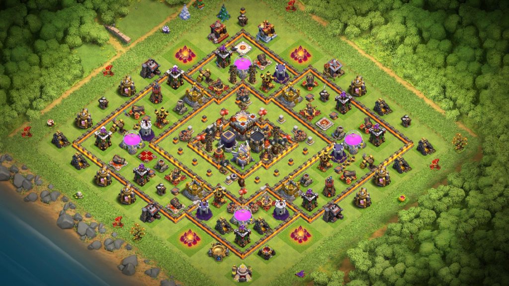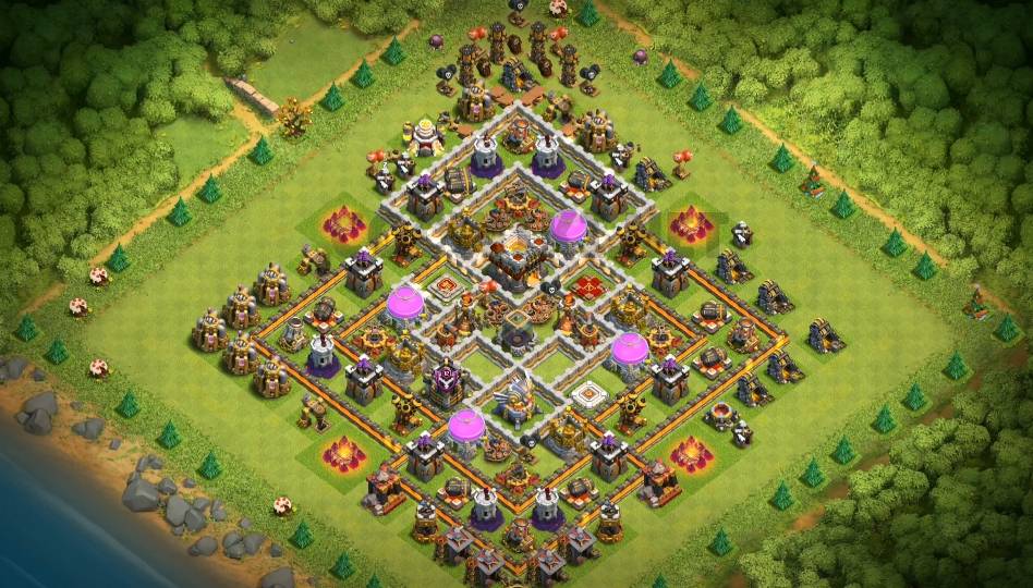 Pada base ini memang sengaja berbentuk berlapis agar pasukan lawan kesulitan menyerang base kamu. Dalam setiap lapis terdapat berbagai macam bangunan pertahanan yang kuat dan trap. Dengan berbagai hal tersebut akan membuat pasukan lawan kamu kesulitan.