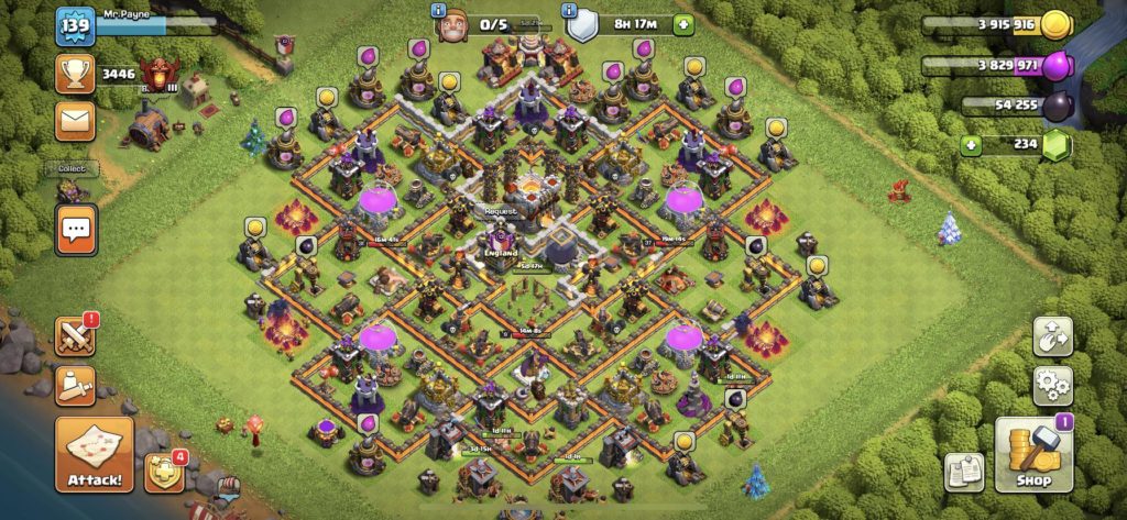 Jika kamu lihat base ini memang mirip dengan base 3. Tapi memiliki perbedaan pada tengah base memiliki bangunan pertahanan lagi yang akan menambah kuat pertahanan dan akan melindungi base kamu dari serangan lawan. Pada base ini juga memiliki banyak bangunan pertahanan dan trap yang akan menyerang pasukan lawan.