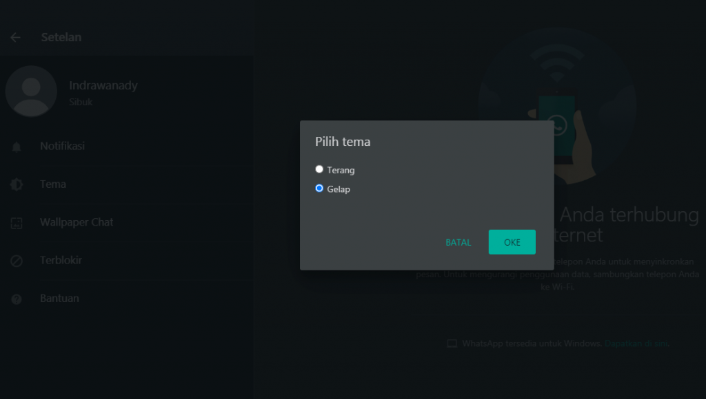 Mode Gelap / Dark Mode sekarang ini sudah banyak digemari oleh banyak orang. Fitur ini dikembangkan oleh developer whatsapp guna mengikuti perkembangan aplikasi-aplikasi lainnya yang sudah terlebih dahulu menggunakan fitur mode gelap ini. Dark mode memiliki manfaat yaitu mengurangi kelelahan mata serta membuat tulisan mudah dibaca.
