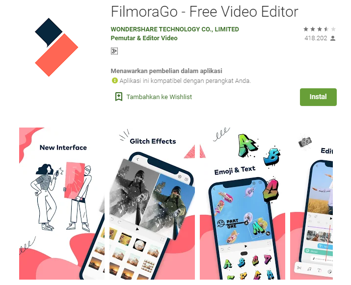 merupakan aplikasi edit video android terbaik yang mudah digunakan karena memiliki fitur-fitur yang canggih sehingga mudah untuk mengedit video. Aplikasi edit video ini dapat digunakan untuk memasukkan dan melakukan editing berupa musik, foto, video, suara dan menambahkan teks di dalam video. Fitur editing lainnya yaitu bisa digunakan untuk zoom, trim, kontrol volume, copy, rotasi dan sebagainya. Download aplikasi FilmoraGo disini