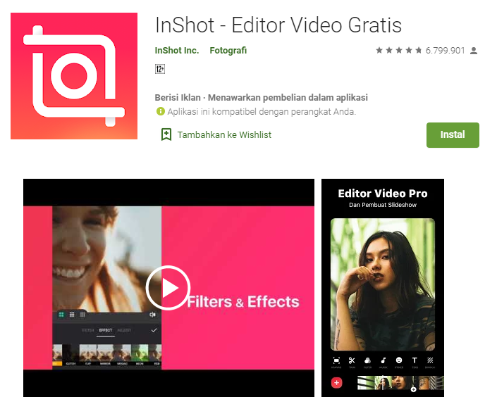Inshot merupakan aplikasi edit video android terbaik satu ini memiliki fitur efek-efek yang menarik untuk digunakan untuk menjadikan video menjadi lebih menarik. Tool yang disediakan juga banyak antara lain tambah musik, filter, efek transisi, teks, stiker, latar blur dan lain-lain. Terdapat juga 55 transisi seperti fade in/out, light, ghost, slice dan lain sebagainya untuk menunjang keperluan edit video. Download aplikasi Inshot disini