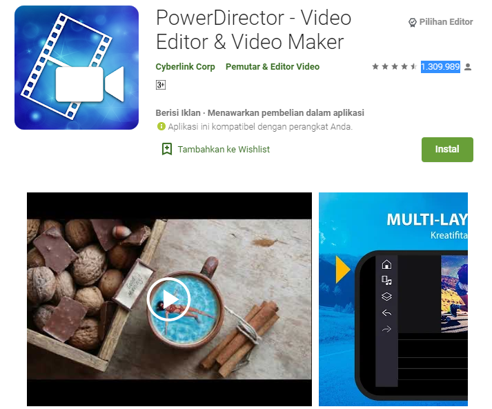 Aplikasi PowerDirector ini memiliki fitur yang lengkap dimana dapat mengedit dan mengekspor video dalam resolusi hingga 4K selain itu juga dapat menstabilkan video serta memiliki efek pencahayaan ganda. Tool yang disediakan untuk melakukan proses editing juga banyak dimana ada banyak template, efek, filter, musik latar belakang yang disediakan secara gratis. Aplikasi ini sudah di download lebih dari 1.000.000 pengguna smartphone dan memiliki rating yang sangat baik. Download aplikasi PowerDirector disini.