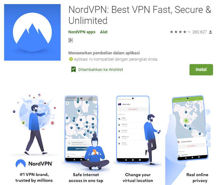 NordVPN adalah VPN yang menawarkan internet cepat, private, dan aman saat berselancar menggunakan jaringan. Aplikasi ini merupakan aplikasi android terbaik karena memiliki fitur yang disediakan adalah fitur enkripsi data, protokol VPN, menyembunyikan alamat IP, mengamankan dari kejahatan siber. Selain itu aplikasi ini juga memiliki 5500+ server di seluruh dunia untuk kecepatan turbo. Download aplikasi disini