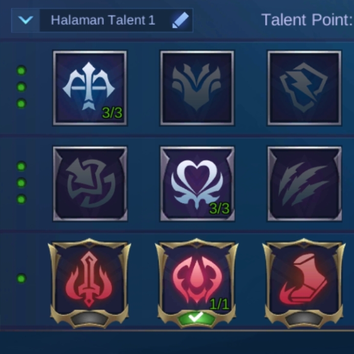 - Blade of Despair, Menyerang unit lawan yang memiliki HP di bawah 50% akan meningkatkan phsyical attack hero sebesar 25%. Berlangsung selama 2 detik (Efek diaktifkan sebelum damage diberikan)