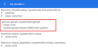 Lalu buka File “init.vbox86.rc” dan kamu edit melalui text Es Note Editor, lalu beri pagar pada ketiga Script berikut ini.