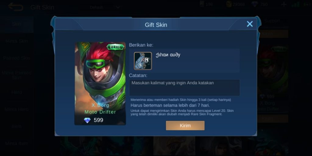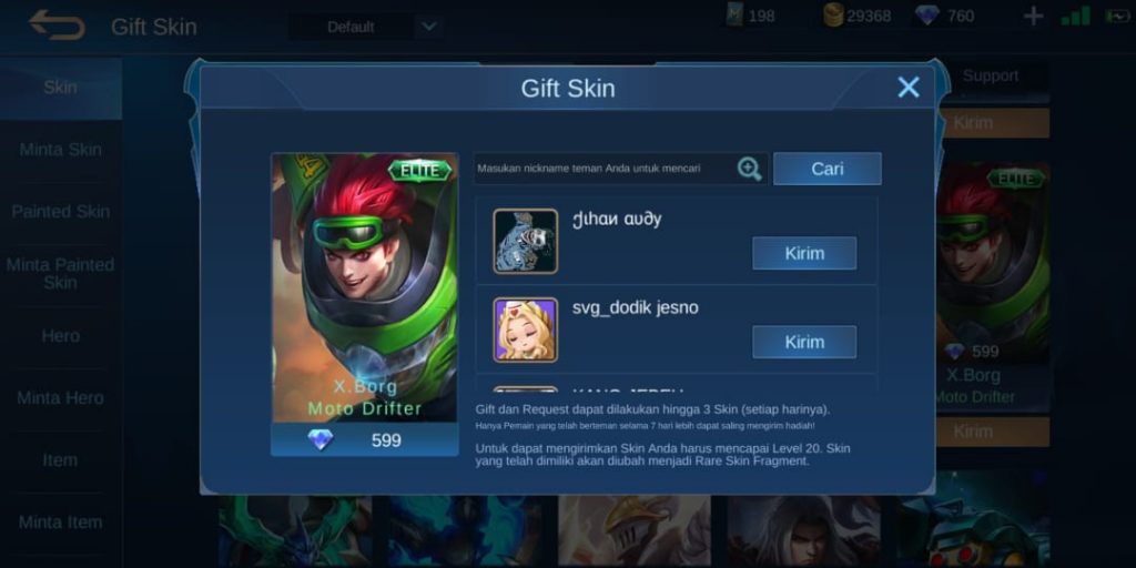 Jika syarat tersebut sudah terpenuhi sobat bisa langsung mengirim skin ke temen kamu, oke mari simak penjelasanya.