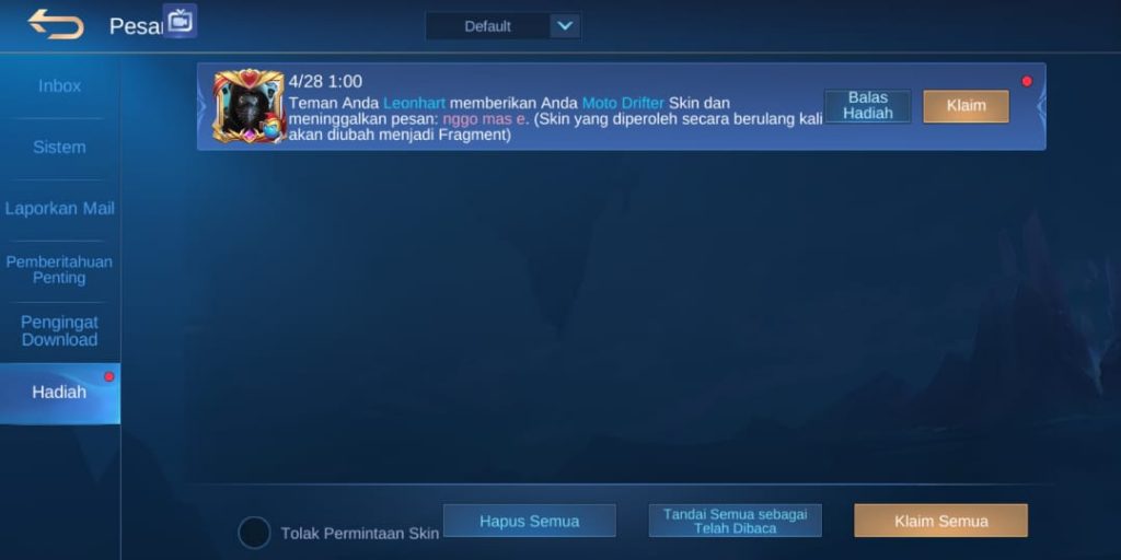 6. Yeeee !!! Skinya sudah sampai ke temen kamu, pastinya temen kamu akan sangat bahagia setelah menerima skin tersebut !