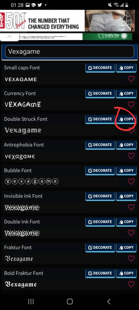 5. Cara lain untuk membuat nama kamu semakin unik, maka kamu bisa menambahkan simbol dengan memilih opsi "DECORATE" yang berada di opsi pertama sebelum "COPY", sesuai lingkaran pada gambar di bawah ini: