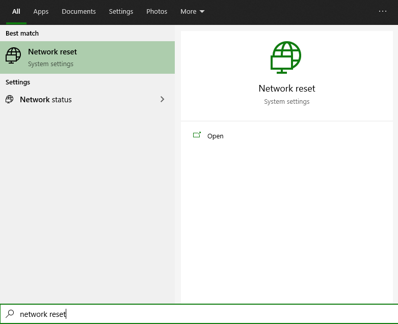 - Tekan tombol windows keyboard lalu ketikkan Network Reset
