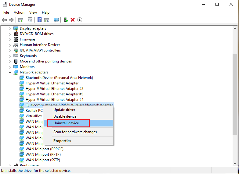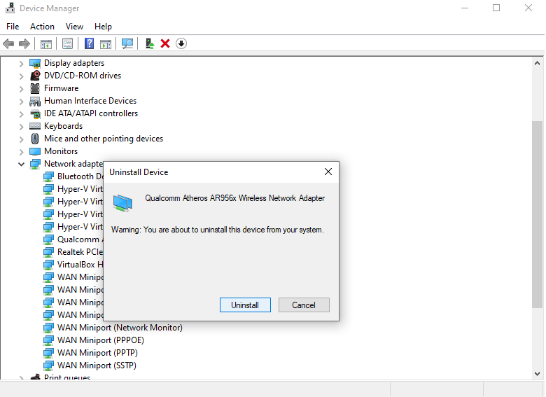 - Pilih Network Adapter lalu cari driver wifi kemudian pilih Uninstall Device
