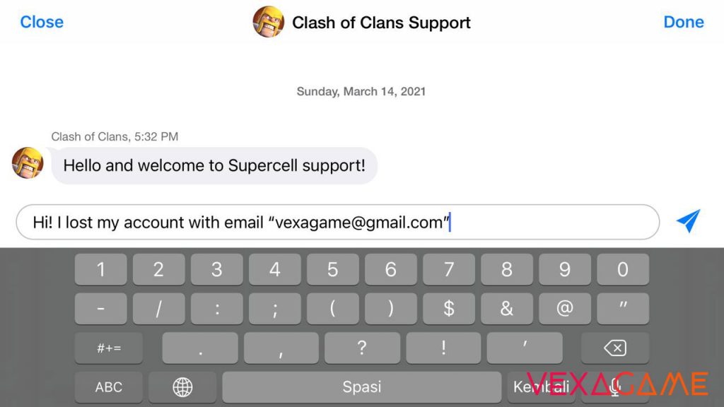 - Lalu hubungi pihak Supercell dengan mendeskripsikan permasalahan kamu dengan format: nama desa, nama klan, level town hall, waktu terakhir memainkan COC dan email COC kamu yang hilang