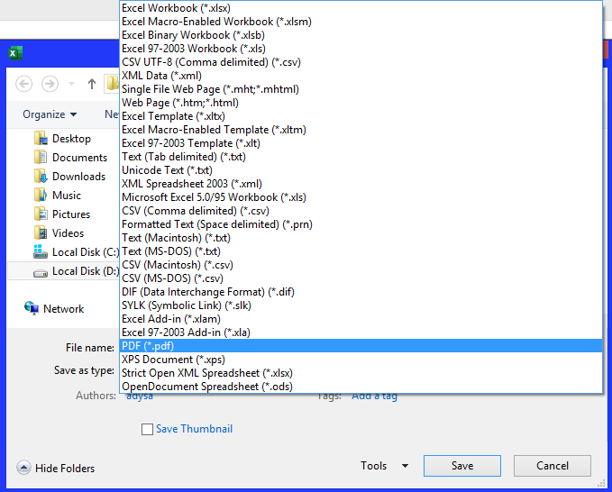 - Muncul kotak dialog kemudian pilih tempat folder untuk menyimpan filenya. Lalu ketikkan nama file , Klik tanda panah lalu pilih format ektensi .pdf yang berfungsi untuk menyimpan format file ektensi dalam bentuk pdf