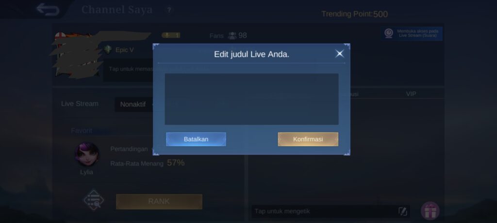4. Kamu akan beralih ke menu "Channel saya" dimana kamu bisa melakukan beberapa peraturan dalam live streamingmu. Disini juga akan dipajang hero favoritmu