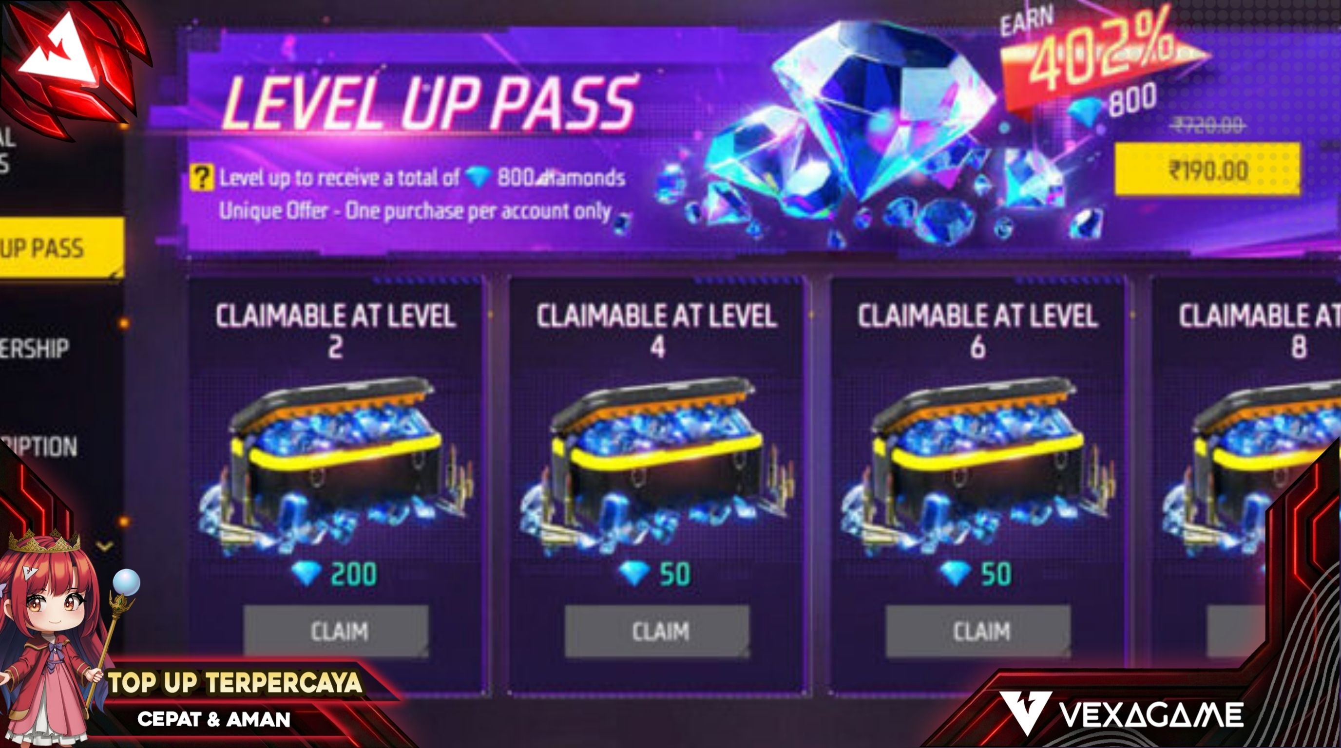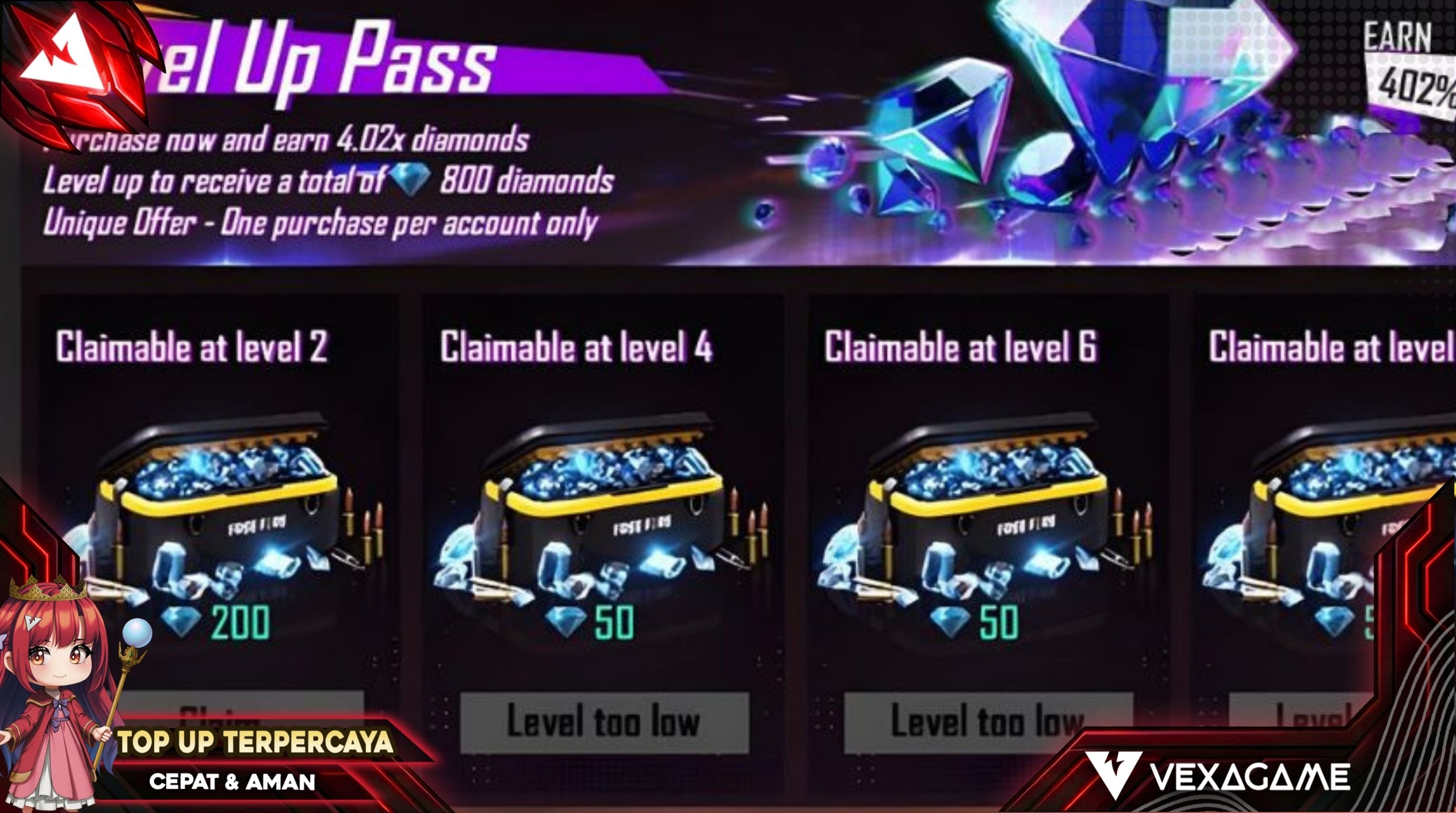 Level Up Pass FF adalah sebuah penawaran Top Up spesial dari Garena yang mendukung pemain untuk mengklaim total hingga 800 Diamond hanya dengan satu kali pembelian. Tapi ada syarat utama yang harus dipenuhi, yaitu Diamond yang hanya bisa dibuka (unlocked) secara bertahap berdasarkan milestone level akun Free Fire.