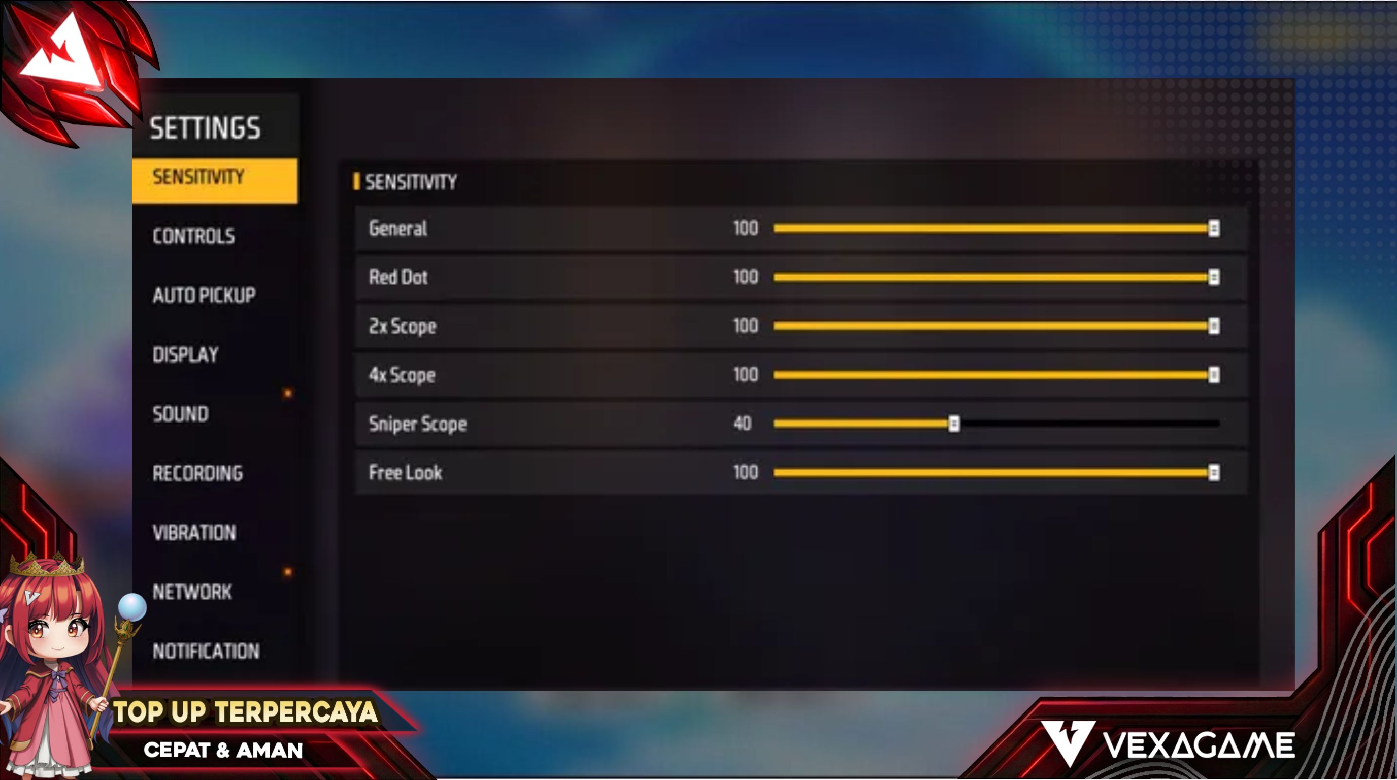 Masuk ke menu Settings lalu pilih tab Sensitivity. Gunakan angka rekomendasi berikut untuk meningkatkan peluang headshot: