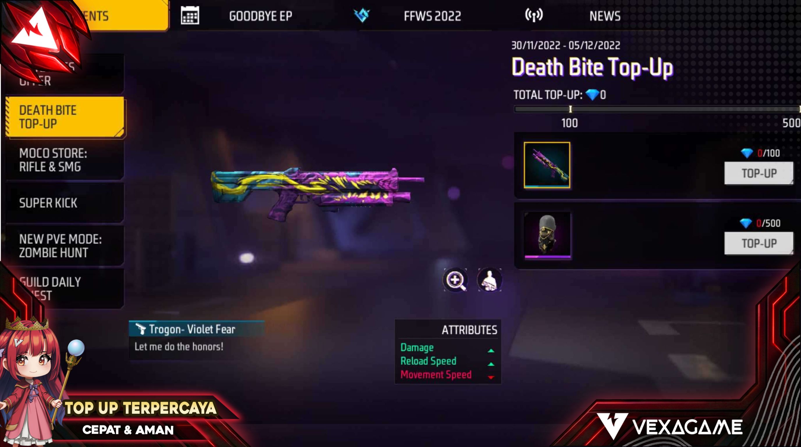 Free Fire memang nggak pernah bosan ngasih tantangan lewat senjata-senjata unik. Contohnya kayak Trogon yang sering bikin emosi tapi asyik buat dimainin. Nah, biar pengalaman mabar kamu makin maksimal dengan skin senjata yang keren dan upgrade yang gahar, jangan lupa buat top up FF di Vexa Game sekarang juga! Legal, aman dan cepat!