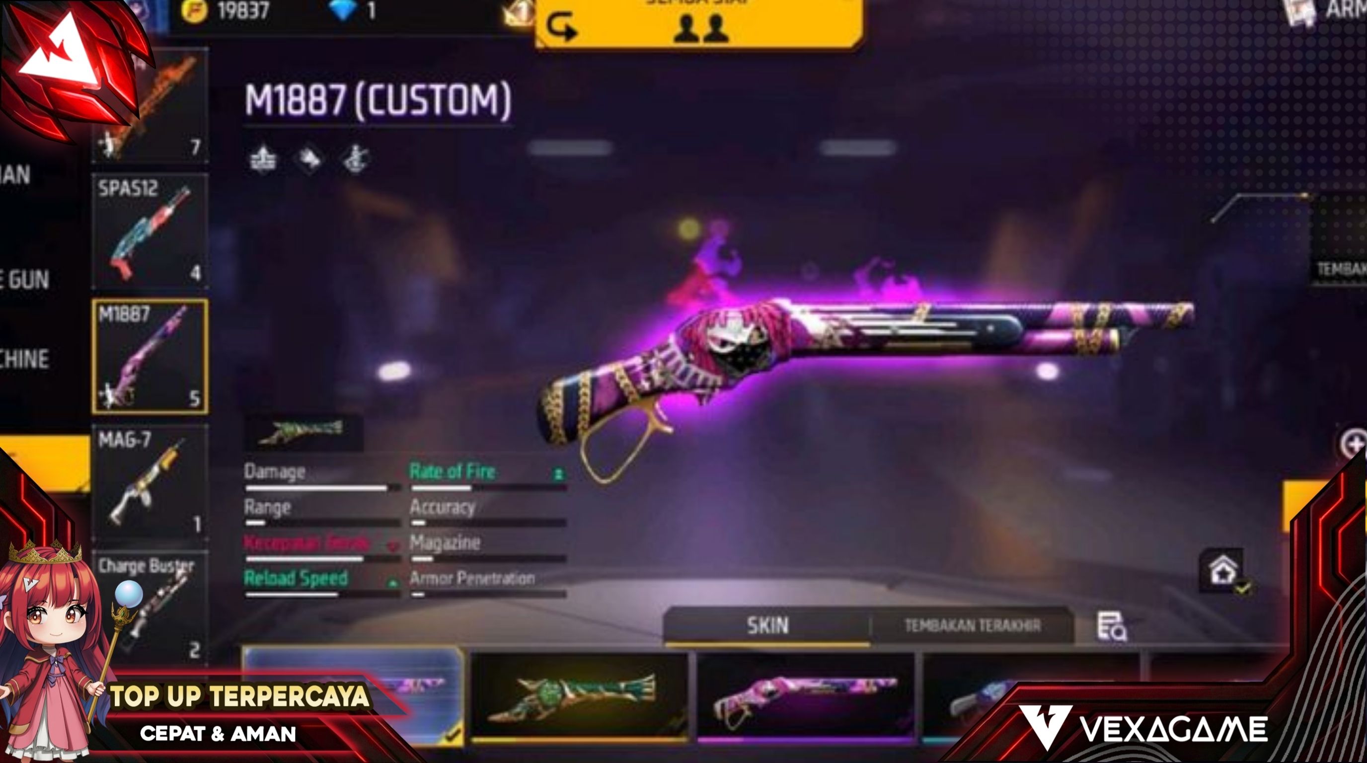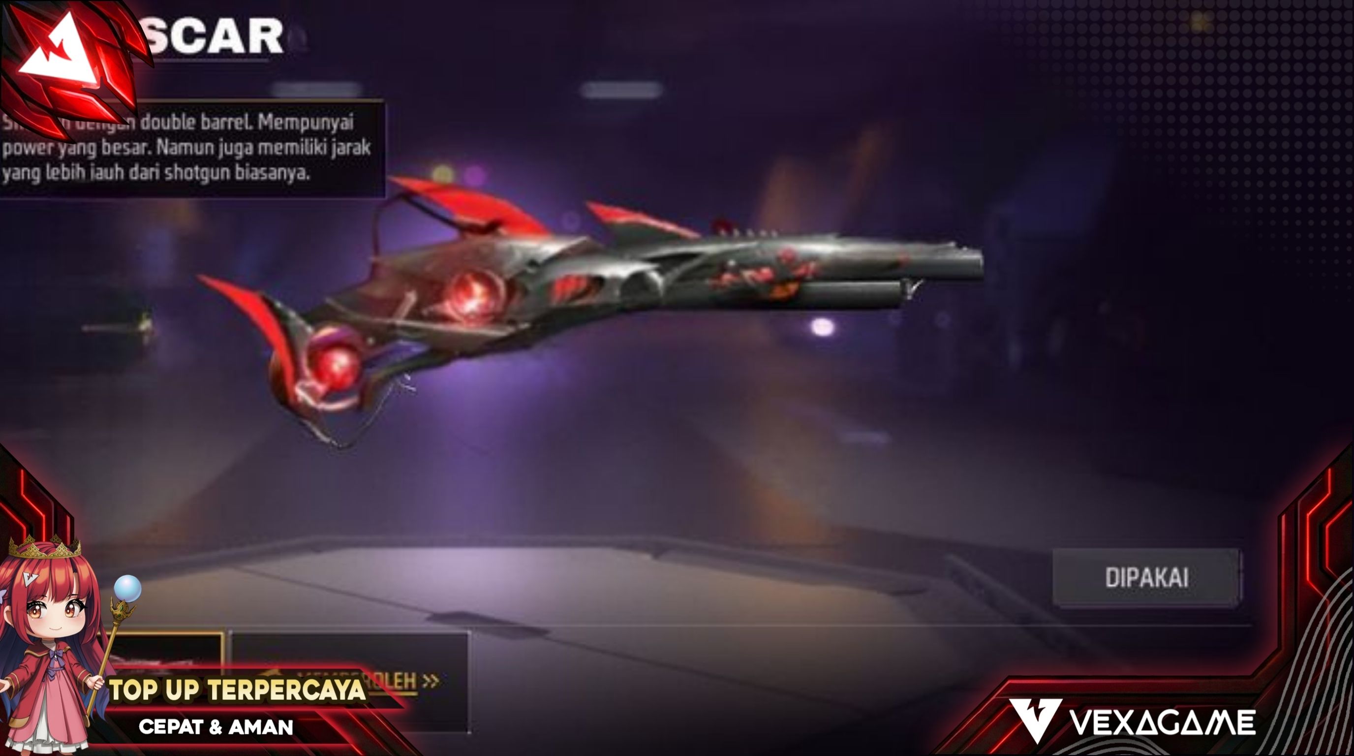Kalau kita bicara soal senjata jarak dekat yang paling ditakuti di tahun 2026, nama SG Reaper pasti masuk di urutan teratas. Senjata yang aslinya adalah skin Evo dari M1887 (Sterling Conqueror) ini punya visual yang gahar banget, lengkap dengan efek sayap mekanik dan aura ungu kehitaman yang bikin musuh gemeteran sebelum kena tembak.