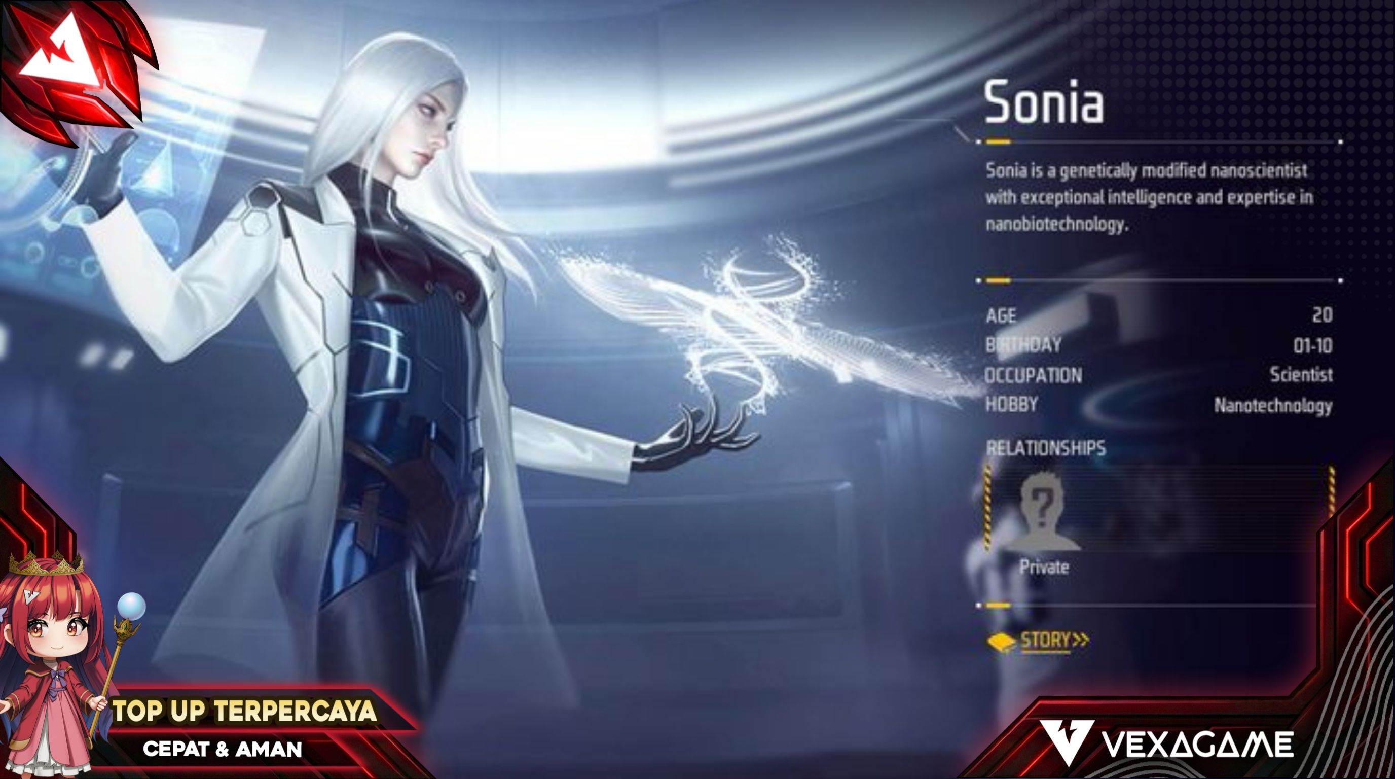 Meski sudah berkali-kali kena nerf, karakter FF Sonia tetap menjadi nyawa cadangan yang paling menyebalkan bagi lawan. Skill pasifnya yang memberikan perlindungan sesaat sebelum kamu benar-benar tereliminasi memberikan waktu 0.5 - 1 detik untuk membalas tembakan atau mencari perlindungan.