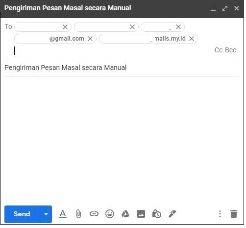 - Lalu pada kolom “Kepada” masukan alamat email satu per satu sesuai dengan berapa banyak alamat email yang akan dikirim pesan email. Untuk memisahkan per alamat email bisa menggunakan spasi.